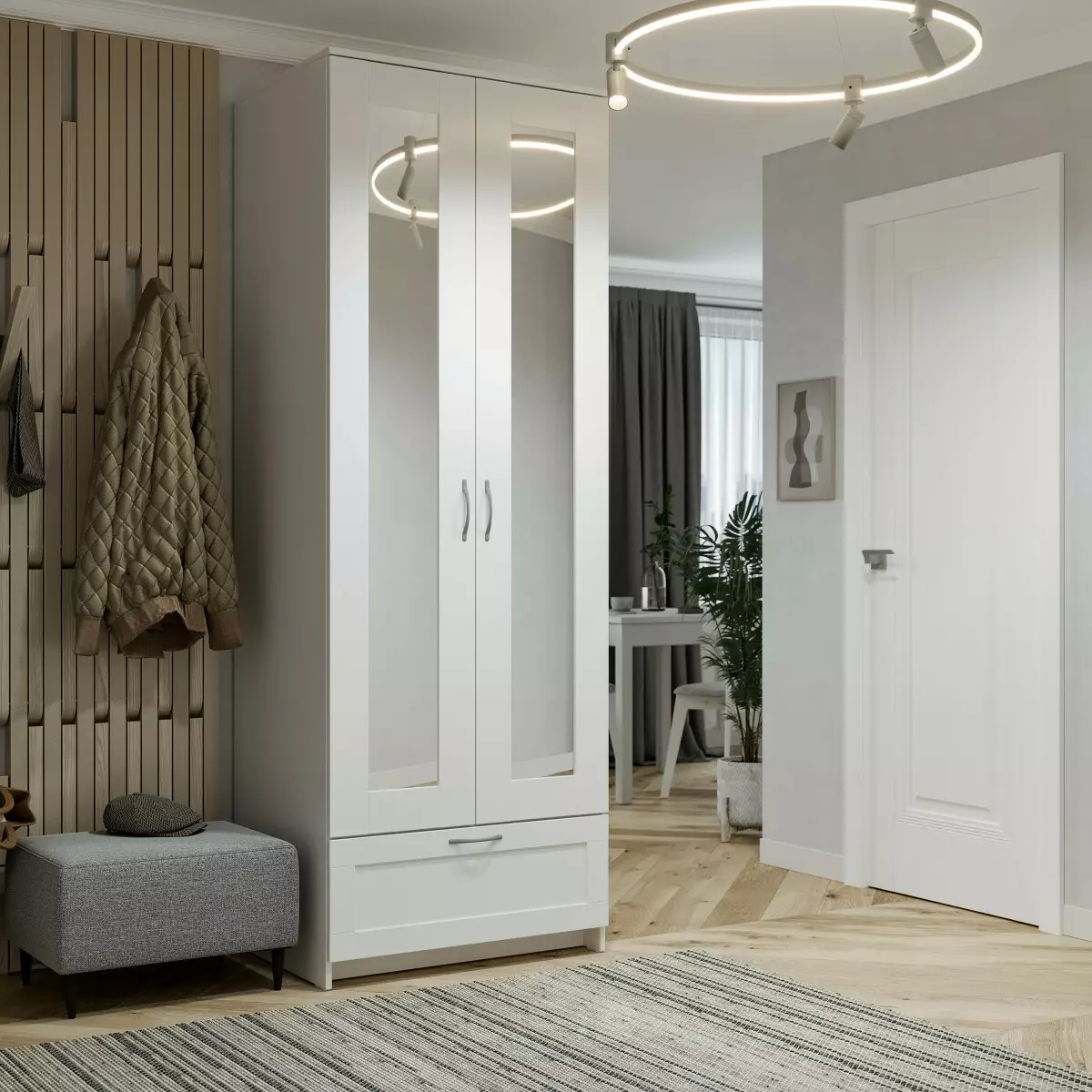 Шкаф Сириус — современное и практичное решение для хранения одежды и вещей в гостиной или прихожей. Универсальный белый цвет и лаконичный дизайн позволяют шкафу легко вписаться в современный интерьер, визуально освежая пространство и делая помещение светлее.