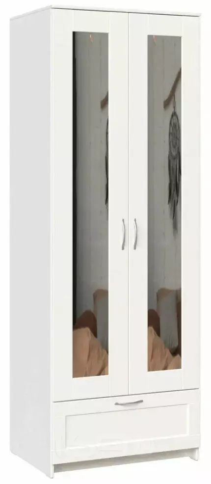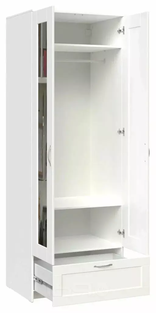 Модель оснащена двумя распашными дверями и удобным выдвижным ящиком, что делает хранение более организованным. Внутри шкафа предусмотрены полки и штанга для одежды, благодаря чему можно удобно разместить как сложенные вещи, так и одежду на плечиках. Зеркало на фасаде добавляет функциональности и помогает визуально расширить пространство комнаты.