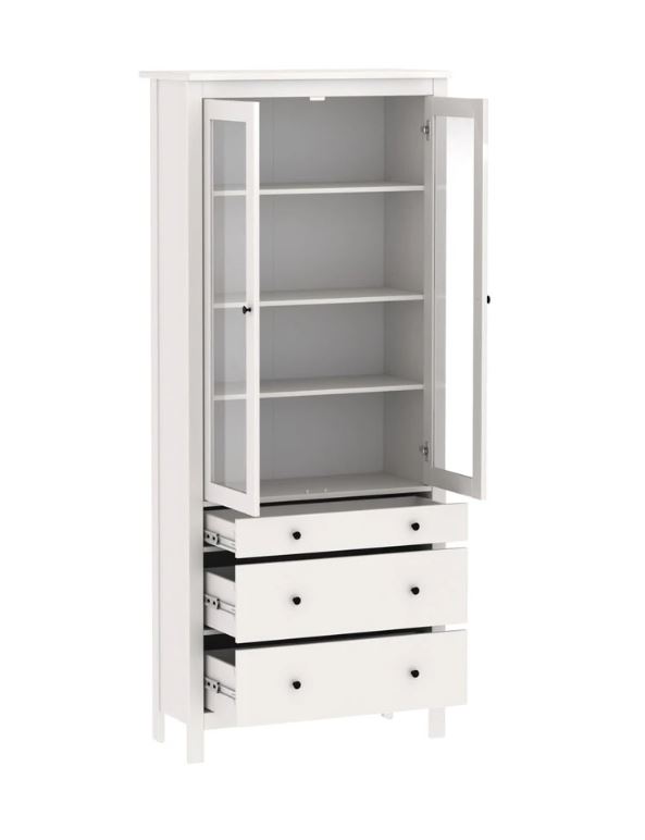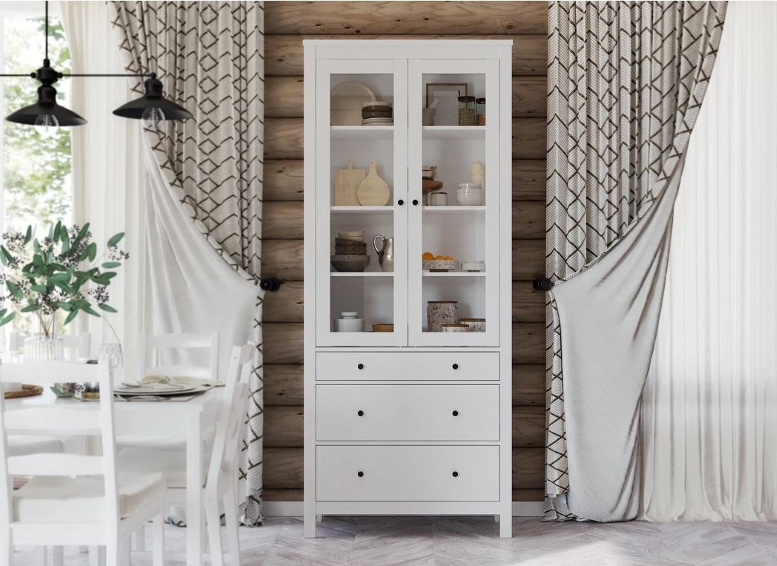 Шкаф-витрина — функциональное решение для гостиной в скандинавском или современном интерьере. Модель выполнена в лаконичном стиле «как в ИКЕА», сочетает закрытое хранение, стеклянные фасады и выдвижные ящики. Подходит для размещения посуды, книг, декора и других предметов, которые важно хранить аккуратно и на виду.