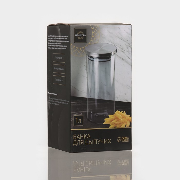 Банка для сыпучих продуктов изготовлена из стекла. Имеет плотно закрывающуюся крышку, которая защищает продукты от влаги и посторонних запахов. В ёмкости удобно хранить крупы, специи, орехи, макаронные изделия, сахар, муку и бобовые.