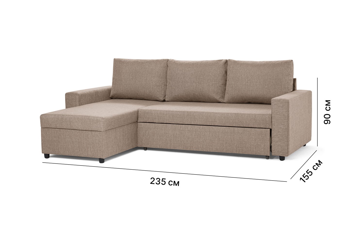 Производитель предусмотрел удобный ящик для хранения вещей или спальных принадлежностей. Надежный механизм типа дельфин позволяет легко трансформировать диван с габаритами 235х90х155 см в спальное место размером 143х204 см.