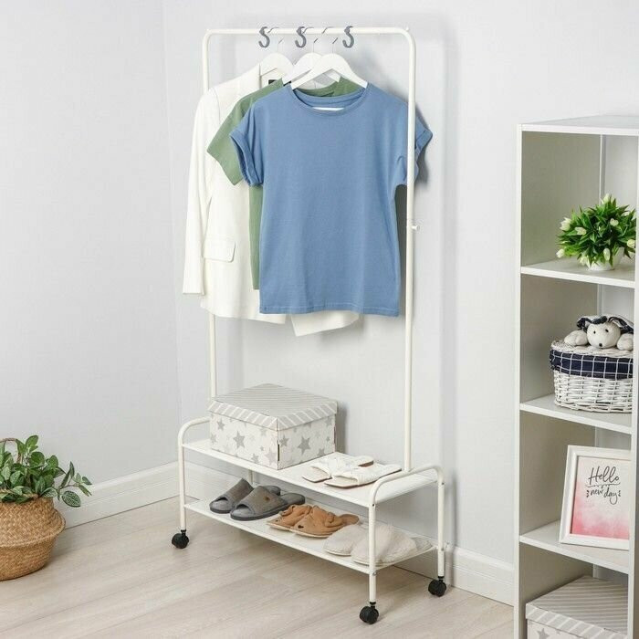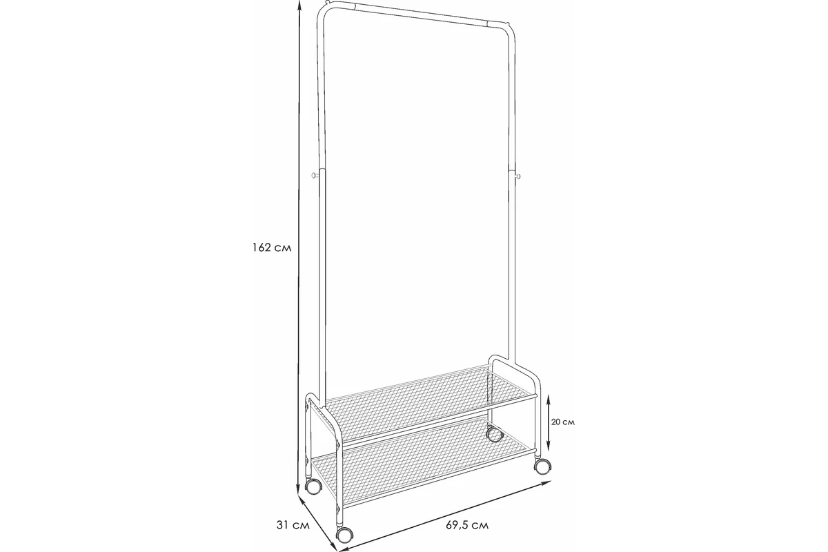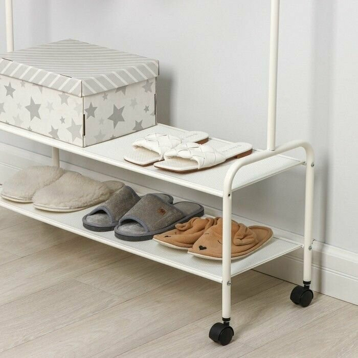 На сетчатых полках с лёгкостью помещается до 4 пар обуви. С помощью колесиков вешалку удобно перемещать по комнате.