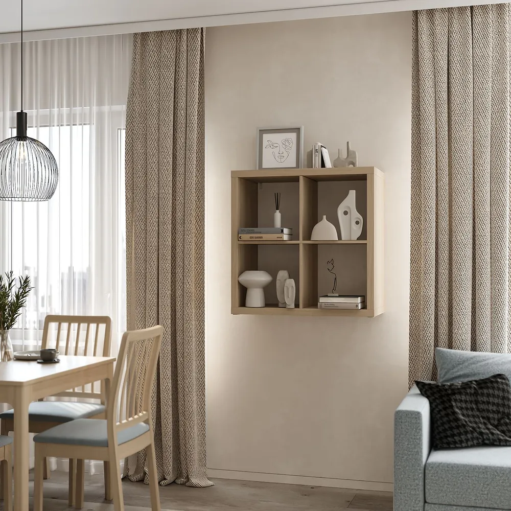 В зависимости от условий использования, легко может стать стильной навесной удобной полкой с четырьмя ячейками. Конструкция рамы - тамбурат (рамка из ДСП и HDF с сотовым заполнением) - популярная современная технология, активно внедряемая крупнейшими производителями для изготовления мебели по скандинавским стандартам.